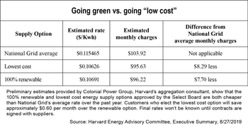 Preliminary price estimates provided this week by the town’s aggregation consultant, Colonial Power Group (CPG) of Marlborough, indicate that both CCA options will be cheaper than current National Grid prices, with savings of $90 to $100 per year. The difference between the 100% renewable and lowest-cost plans was estimated to be only $0.60 per month, or $7 per year (see table).